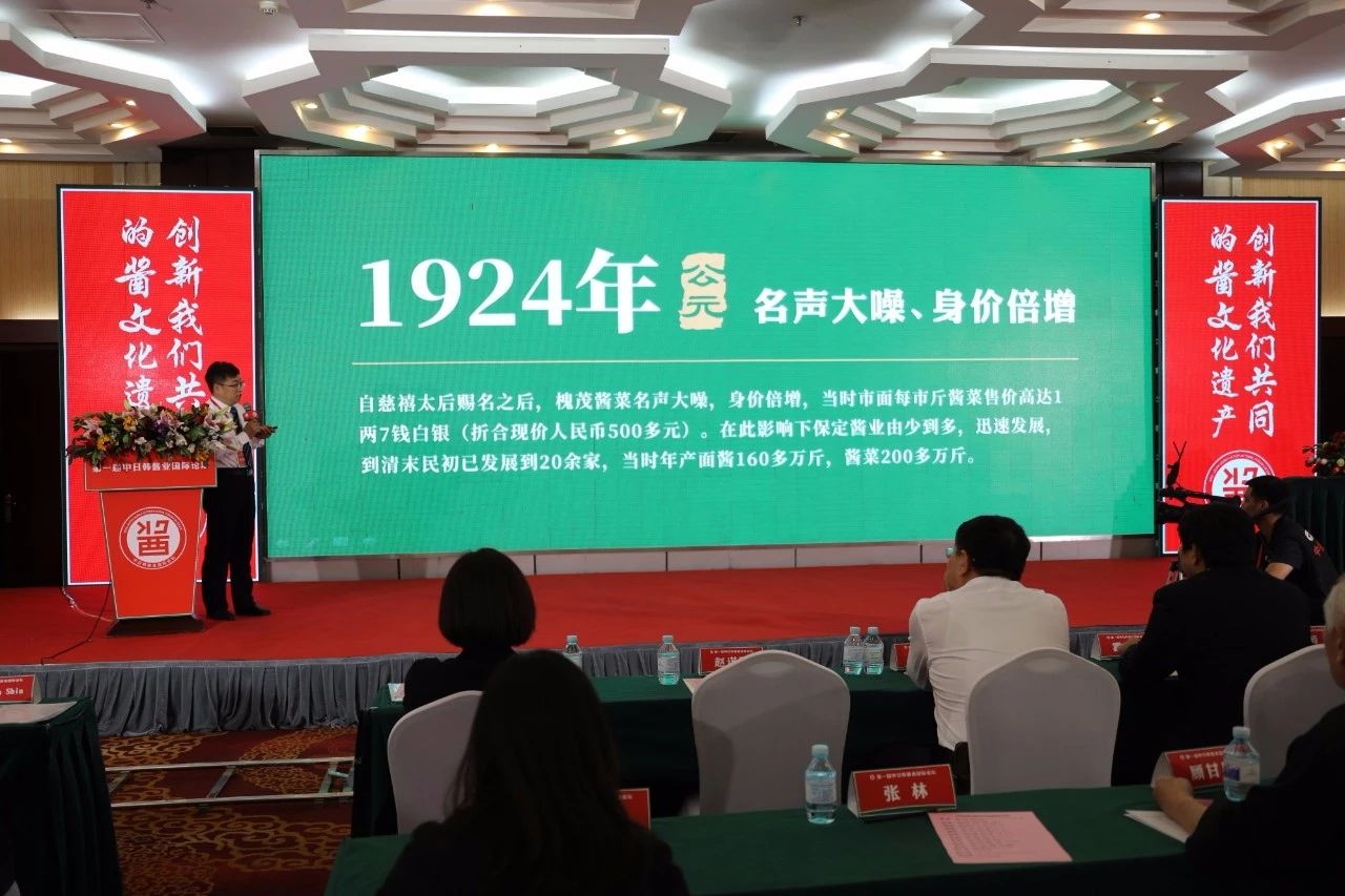 作为保定乃至中国酱业最悠久的老字号之一,拥有347年发展历史的槐茂在论坛发表了《科技为先 传承槐茂酱文化》的专题报告。在347年的发展历程中,槐茂始终保持着内在的生长力,从产品、技术与设备三个方面不断创新,历史上曾先后生产出了“春不老”、“槐茂甜面酱”、“槐茂酱园小菜”等闻名古今的特色名产,研制出“国内第一台切菜机”、“ 单螺旋面酱开扒机”等关键设备。